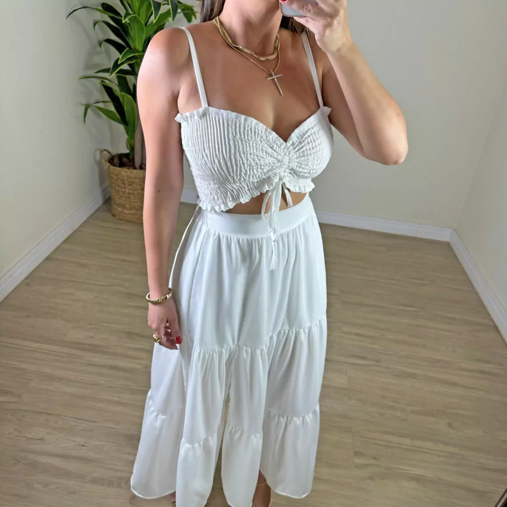 A modelo, Camila, veste 36/38 e possui 166 cm de altura. Adquira já o seu Conjunto Feminino Zoe e arrase em qualquer evento!