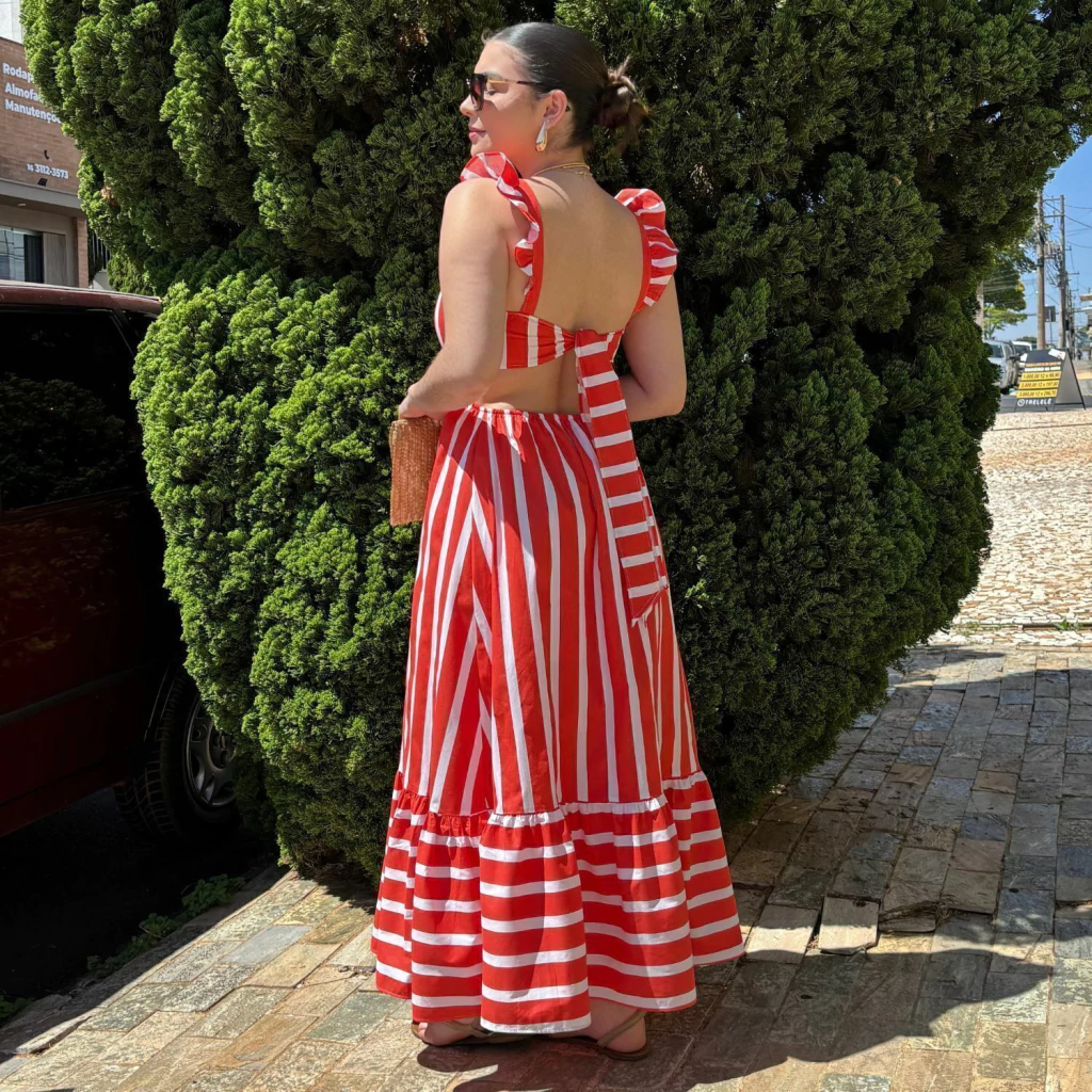 O Vestido Listrado Maly é a peça perfeita para quem busca leveza e sofisticação em um só look. Confeccionado em tricoline 100% algodão, ele garante frescor, toque macio e caimento impecável, sendo ideal para dias quentes e produções casuais cheias de charme.
